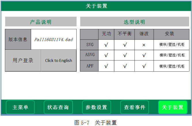 ZLDL-SVG通过集成在一块面板上的显示屏和按键进行操作。其中,5.1-5.6节为集中显示大触摸屏的操作,5.7-5.8为模块小屏的操作